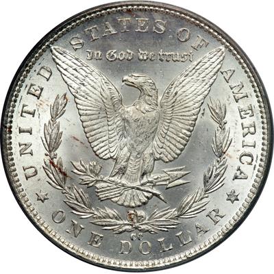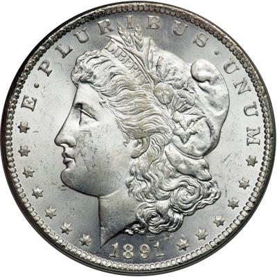 1891-CC Morgan Dollar. PCGS graded MS-64. A nice white example. There is a stray bagmark below the eye, otherwise full blast-white luster and near-Gem level indications in the frost, the strike, as well as in the overall aesthetic appeal (PCGS # 7206).