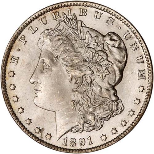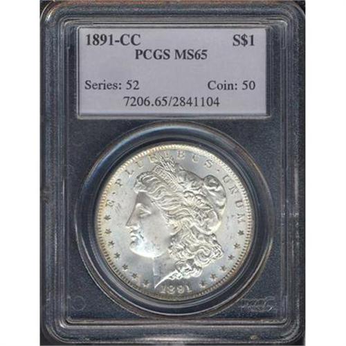 <b>1891-CC Morgan Dollar. PCGS graded MS65.</b> A beauty, with nice snappy white color on undisturbed surfaces free of discoloration. Whereas many 1891-CC dollars come with a dampened impression from the weak impact of the dies that made this year's coinage, this lovely Gem, rather than being halfhearted, is boldly crisp <b>(PCGS # 7206)</b>