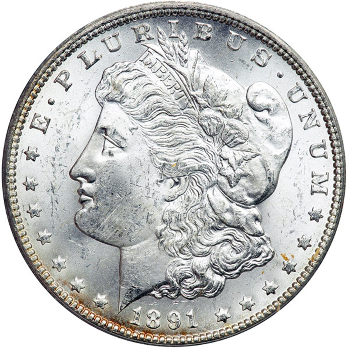 1891-CC Morgan Dollar. PCGS graded MS-63. Frosty and mostly untoned, a choice example (PCGS # 7206) .