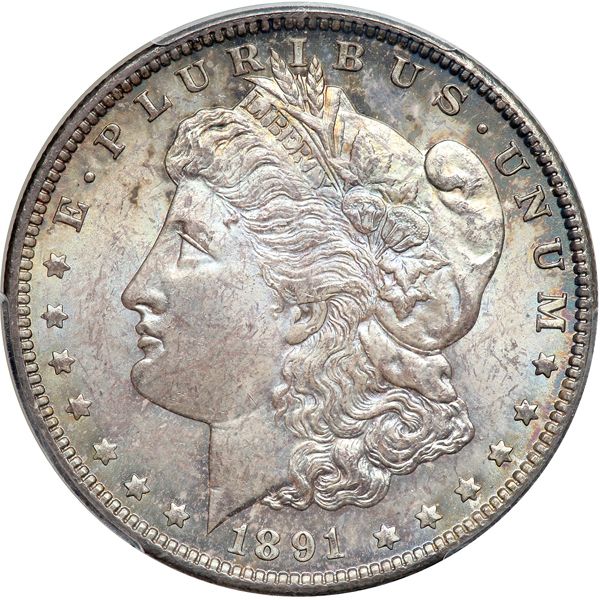 1891-CC Morgan Dollar. PCGS graded MS-63 PQ CAC Approved. Lovely blue and lilac toning from being in an envelope for over 50 years (PCGS # 7206) .