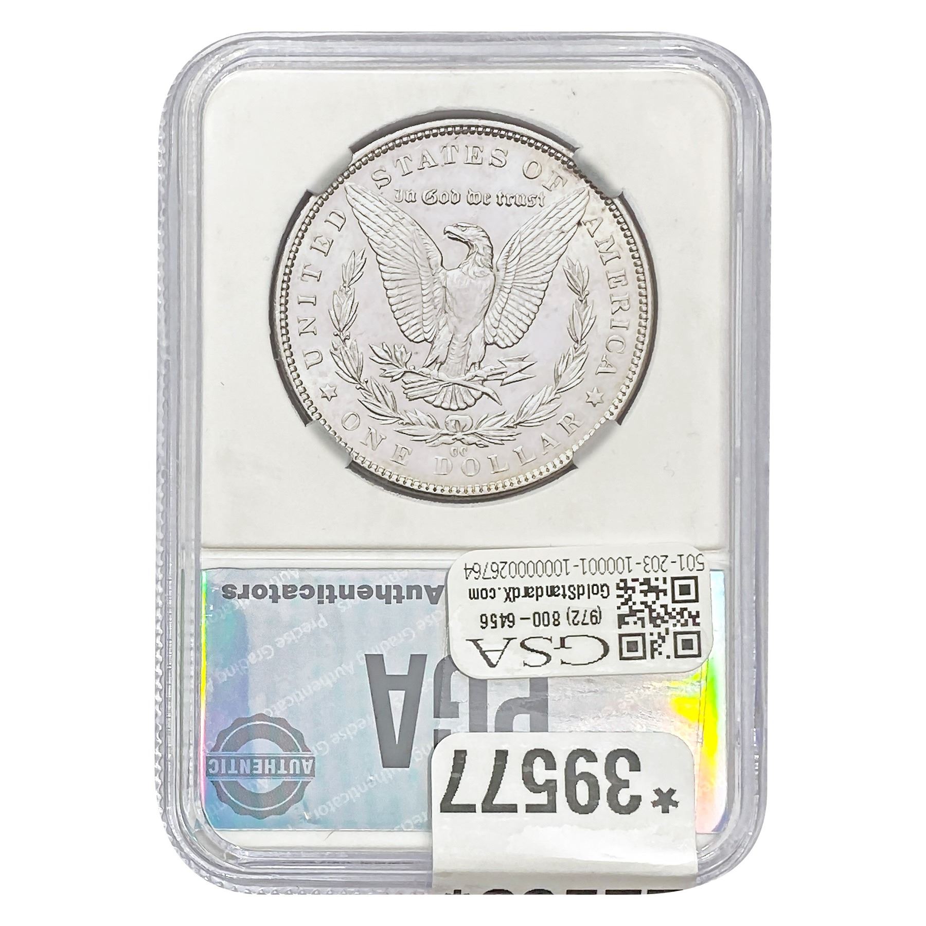 COINS AND CURRENCY LISTED IN GSA’S CATALOG AS GRADED AND ENCAPSULATED BY PCGS, NGC, ANACS, ICG, PCGS CURRENCY, PMG, PCGS BANKNOTE GRADING, CMC OR ANY OTHER THIRD-PARTY GRADING SERVICE ARE LIKEWISE SOLD “AS-IS” EXCEPT AS EXPRESSLY SET FORTH HEREIN. ALL THIRD-PARTY GRADING SERVICE GUARANTEES, INCLUDING AUTHENTICITY, ARE THE SOLE RESPONSIBILITY OF THE THIRD-PARTY GRADING SERVICE AND NOT WARRANTIES OR GUARANTEES OF GSA. BIDDERS SHOULD CONTACT THESE THIRD-PARTY GRADING SERVICES DIRECTLY WITH RESPECT TO ANY CLAIMS OR QUESTIONS THEY MAY HAVE CONCERNING THEIR GUARANTEES AND WARRANTIES. BIDDERS ACKNOWLEDGE AND AGREE THAT AUCTIONEER IS NOT BOUND BY OR LIABLE FOR ANY OPINION OR CERTIFICATION BY ANY THIRD-PARTY GRADING SERVICE. REMOVAL OF A PRODUCT FROM ITS PROTECTIVE CASING OR HOLDER OR ALTERATION OF ANY COIN HOLDER WAIVES ALL RIGHTS CONCERNING THE PRODUCT CONTAINED THEREIN.