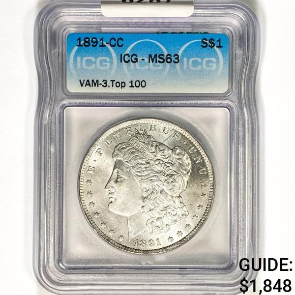 1891-CC Morgan Silver Dollar ICG MS63 VAM-3