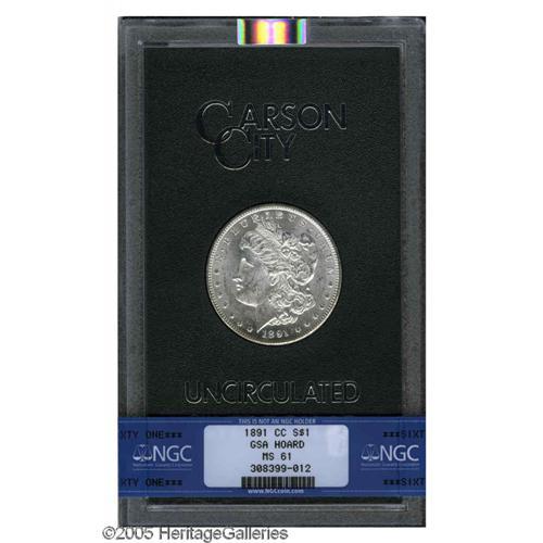 <B>1891-CC<S$1> MS61 GSA Dollar NGC.</B></I> A brilliant, but heavily marked example of this collectible CC Dollar. Bright mint luster shows overall. This lot includes the original box.