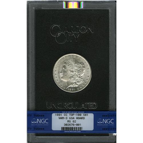 <B>1891-CC<img border='0' src='http://www.heritagecoins.com/images/star.gif' width=10 height=10>$1> MS62 NGC.</B></I> VAM-3. A Top 100 Variety. A lustrous and gently toned representative with good eye appeal for the grade. Well struck, even on the sometimes suspect centers. The box and certificate of GSA issue accompany.