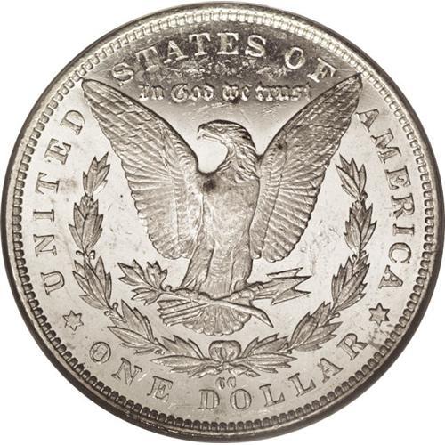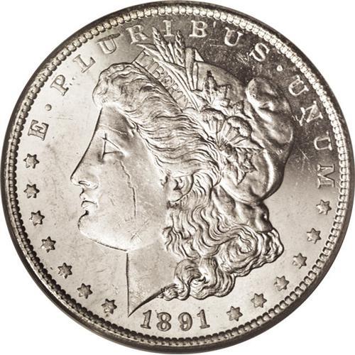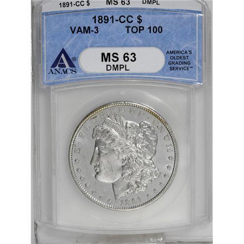 <B>1891-CC<img border='0' src='http://www.heritagecoins.com/images/star.gif' width=10 height=10>$1> MS63 Deep Mirror Prooflike ANACS.</B></I> VAM-3. A Top 100 Variety. This flashy Carson City dollar demonstrates pleasing white-on-black contrast, particularly on the reverse. Brilliant aside from a couple of tiny brown spots on the reverse. A couple of moderate marks on the cheek determine the grade.