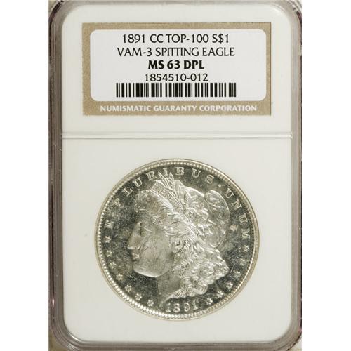 <B>1891-CC S$1 MS63 Deep Mirror Prooflike NGC.</B></I> VAM-3. A Top 100 Variety. The Spitting Eagle variety, a popular and plentiful variant with the always-desired CC mintmark. Most examples found lack the bold contrast of the present example, however, with untoned brilliant fields and thickly frosted devices. The obverse shows moderate abrasions and a small planchet lamination. Census: 65 in 63, 23 finer (4/07).<BR><BR><b>Shipping:</b> Coins & Currency (<a target="_blank" href="http://www.heritageauctions.com/common/shipping.php">view shipping information</a>)