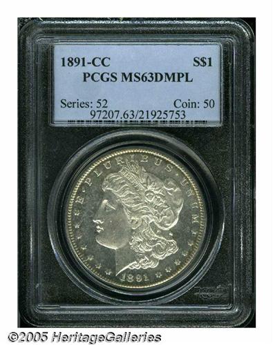 <B>1891-CC<S$1> MS63 Deep Mirror Prooflike PCGS.</B></I> A highly appealing, deeply mirrored Prooflike coin, with watery mirrors that reveal great depth of reflectivity around the frosty devices. Well struck with numerous small to mid-sized abrasions on each side. Population: 100 in MS63 DMPL, 43 finer (6/05).