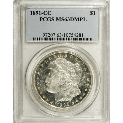 <B>1891-CC S$1 MS63 Deep Mirror Prooflike PCGS.</B></I> VAM-3. A Top 100 Variety. The "Spitting Eagle" variety comprises a goodly portion of the '91-CC production, but only a small fraction of these pieces possess prominently mirrored fields. The devices are suitably frosty, and the strike is meticulous.<BR><BR><b>Shipping:</b> Coins & Currency (<a target="_blank" href="http://www.heritageauctions.com/common/shipping.php">view shipping information</a>)
