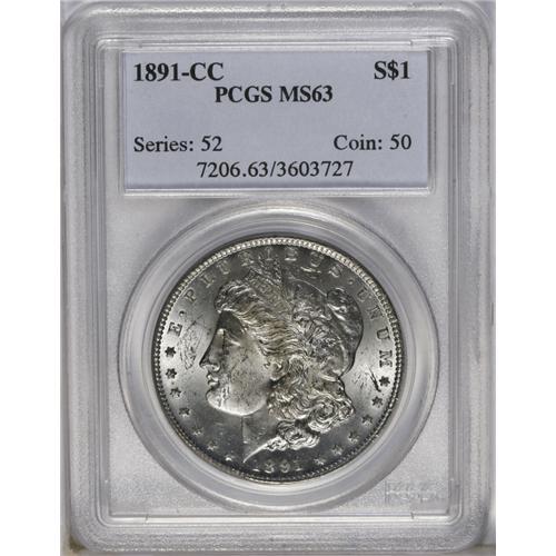 <B>1891-CC<img border='0' src='http://www.heritagecoins.com/images/star.gif' width=10 height=10>$1> MS63 PCGS.</B></I> Largely untoned with a blush of rose on the well struck cheek. This lustrous, Select coin has the abrasions one would expect for the grade.