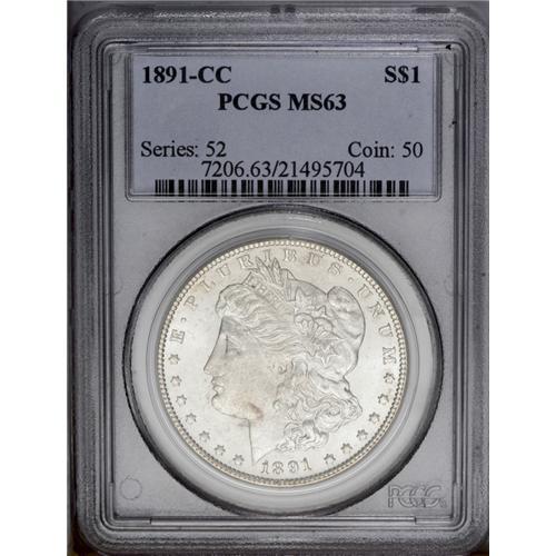 <B>1891-CC<img border='0' src='http://www.heritagecoins.com/images/star.gif' width=10 height=10>$1> MS63 PCGS.</B></I> The design features are sharply impressed, and lustrous surfaces display just a hint or two of light color. Minute contact marks and luster grazes on the obverse limit the grade. <BR><BR><B>Important notice:</B> Heritage usually auctions material at the rate of 200-250 lots per hour. On some occasions eBay Live bid software or the Internet may not be able to keep up with the pace of the auction. We recommend placing a realistic absentee bid now as insurance to avoid disappointment. Occasionally the auctioneer may eliminate or reject an eBay Live bid, and the auctioneer may also reopen a lot after the close of the eBay live bidding (usually because we missed an audience bid), and may reject your bid even if it shows you as the winning bidder. By bidding via eBay Live, you agree that Heritage may award the lot to another bidder at its sole discretion under the circumstances described above or any other reasonable circumstances. Since eBay bids are not shown to us until we open the lot on the floor, we treat those bids just like floor bids. In most cases the floor responds before the eBay bid is presented to us, due to Internet lag time, so for consistency we have made it a policy that floor bids are always considered first over tie eBay live bids. Also please note that all Heritage lots purchased through eBay Live carry a 20% Buyer's Premium. Please make sure you read the Terms and Conditions before you bid. This lot is being auctioned in conjunction with a live floor auction by Heritage Galleries & Auctioneers. All final auction and invoice information will be supplied by Heritage Galleries & Auctioneers, and all other information should be considered preliminary. Lot:3564 <BR><BR><B>Winning Notification and Billing:</B> After the FINAL session in this auction is complete, Heritage will send e-mail and snail mail invoices. This process normally takes several days. All final auction and invoice information will be supplied by Heritage Galleries & Auctioneers, and all other information should be considered preliminary. <BR><BR>This auction will be conducted on a live auction floor and over the Internet through eBay Live. If you choose to place an absentee bid, please take a moment to <font color='#0000ff'><u><a href='http://pages.ebay.com/liveauctions/help/before/laabsentee.html'>learn how eBay Live absentee bidding works</a></u></font><font color='#000000'>