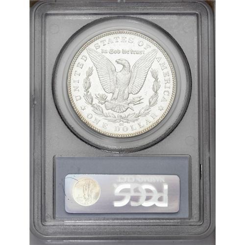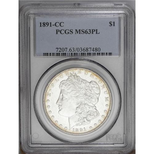 <B>1891-CC<img border='0' src='http://www.heritagecoins.com/images/star.gif' width=10 height=10>$1 MS63 Prooflike PCGS.</B></I> Wispy hairlines and minor abrasions are reflected in the fields, appearing more numerous than they actually are. This is a lovely dollar with brilliant silver surfaces and hints of gold toning along the borders.