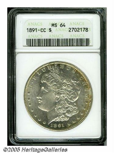 <B>1891-CC<S$1> MS64 ANACS.</B></I> The obverse is well struck and shows medium golden color at the border, while the reverse has creamy white patina. An impressively preserved near-Gem.