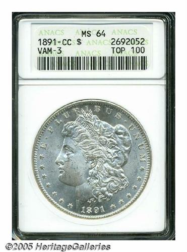 <B>1891-CC<S$1> MS64 ANACS.</B></I> VAM-3. A Top 100 Variety. Booming luster and an intricate strike affirm the quality of this lustrous, high end near-Gem. Not far from brilliant, but both sides display occasional glimpses of tan-gray color.