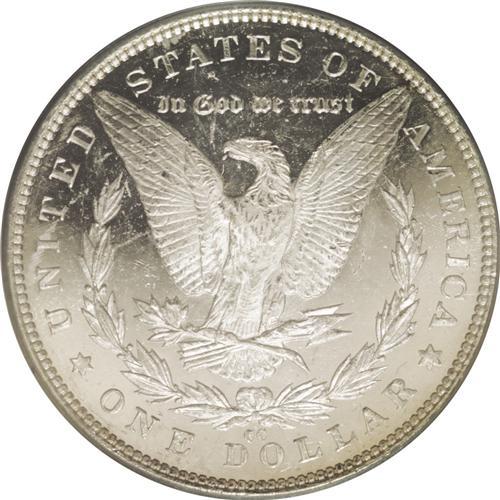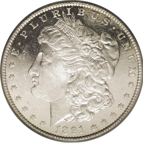 <B>1891-CC<img border='0' src='http://www.heritagecoins.com/images/star.gif' width=10 height=10>$1> MS64 Deep Mirror Prooflike PCGS.</B></I> VAM-3. A Top 100 Variety. This brilliant white-on-black near-Gem was perhaps among the first "Spitting Eagle" dollars struck, since the fields are strongly prooflike. Crisply struck, and the reverse is particularly smooth. Population: 45 in 64, 1 finer (6/06).