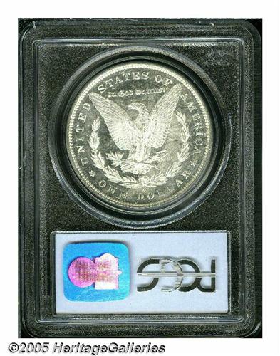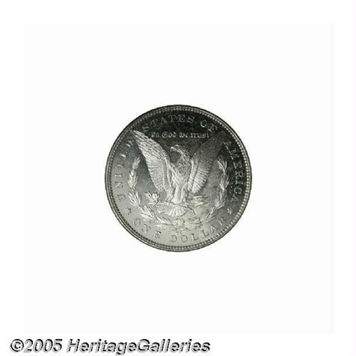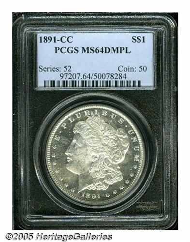 <B>1891-CC<S$1> MS64 Deep Mirror Prooflike PCGS.</B></I> VAM-3. A Top 100 Variety. The "Spitting Eagle" variety, always available in Choice Mint State with cartwheel luster, but rare with deeply mirrored fields and pleasing white on black contrast. Brilliant aside from a blush of milky gray color near the arrowheads. A couple of moderate marks on the cheek, these do not threaten the imposing eye appeal. Population: 42 in 64, 1 finer (6/05).