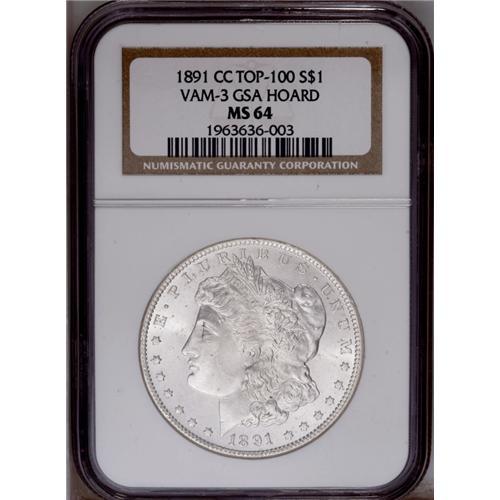 <B>1891-CC<img border='0' src='http://www.heritagecoins.com/images/star.gif' width=10 height=10>$1> MS64 NGC.</B></I> Ex: GSA Hoard. VAM-3. A Top 100 Variety. A sharply struck and pleasingly lustrous near-Gem, nearly brilliant although a hint of chestnut color is present. A carefully preserved example of the collectible "Spitting Eagle" Carson City Dollar.