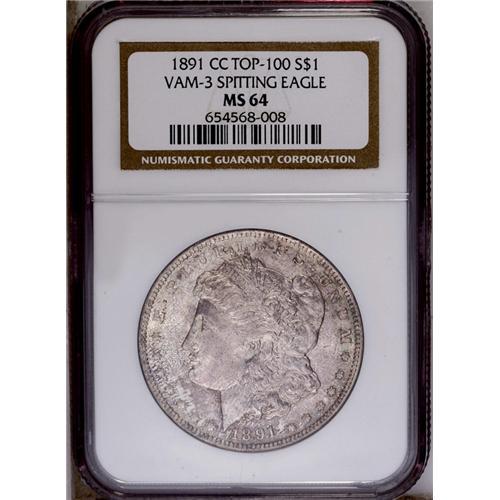 <B>1891-CC<img border='0' src='http://www.heritagecoins.com/images/star.gif' width=10 height=10>$1> MS64 NGC.</B></I> VAM-3. A Top 100 Variety. Dappled lavender and forest-green toning envelops this lustrous and lightly abraded "Spitting Eagle" dollar. Faint mint-made roller marks across the central obverse are inconspicuous.
