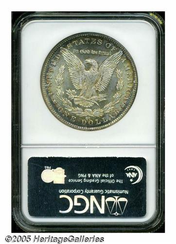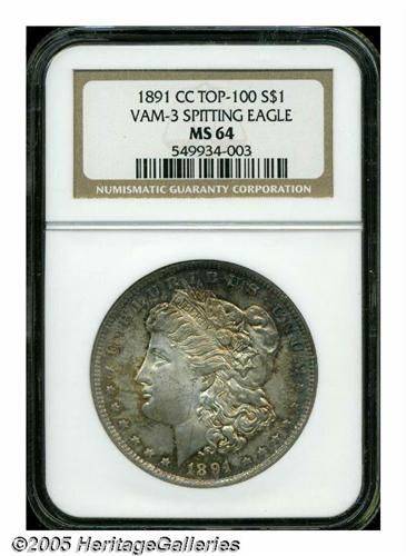 <B>1891-CC<S$1> MS64 NGC.</B></I> VAM-3, A Top 100 Variety. The so-called "spitting eagle." Sharply struck devices and lustrous surfaces with gorgeous, original peripheral multicolored toning. A few very minor marks on Liberty's cheek limit the grade.