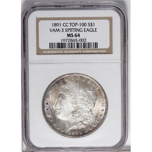 <B>1891-CC S$1 MS64 NGC.</B></I> VAM-3. A Top 100 Variety. The "Spitting Eagle" takes a bow on this frosty near-Gem. Well struck with pleasing red and violet patina in the fields.<BR><BR><b>Shipping:</b> Coin/Currency (<a target="_blank" href="http://www.heritageauctions.com/common/shipping.php">view shipping information</a>)