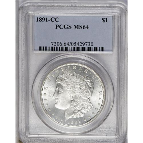 <B>1891-CC<img border='0' src='http://www.heritagecoins.com/images/star.gif' width=10 height=10>$1> MS64 PCGS.</B></I> A flashy and untoned example with reflective surfaces and mint frost on the reverse devices. Crisply struck with just a few stray marks that preclude Gem status.