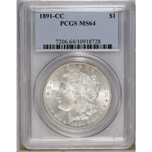<B>1891-CC S$1 MS64 PCGS.</B></I> A well struck near-Gem that has original, somewhat frosty luster. Pale blue toning appears at the reverse periphery, as does a small spot of dark gray between the AT of STATES, but the rest of the piece is virtually untoned.<BR><BR><b>Shipping:</b> Coin/Currency (<a target="_blank" href="http://www.heritageauctions.com/common/shipping.php">view shipping information</a>)