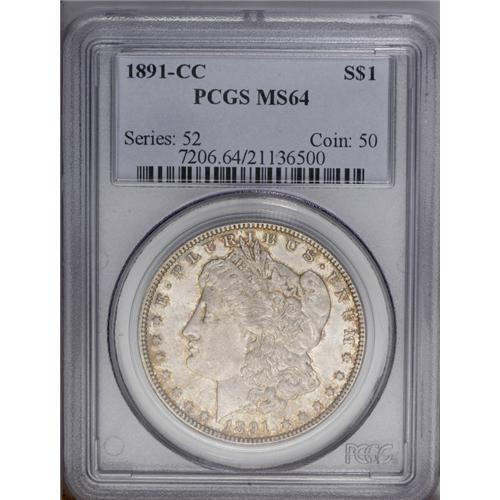 <B>1891-CC<img border='0' src='http://www.heritagecoins.com/images/star.gif' width=10 height=10>$1 MS64 PCGS.</B></I> Generally well struck (even if slightly weak above Liberty's ear) with captivating satiny luster and dappled olive and orange patina near the peripheries. Minor obverse marks prevent a higher grade assessment.