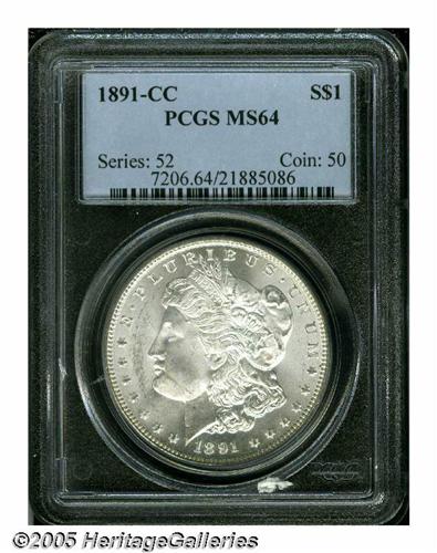 <B>1891-CC<S$1> MS64 PCGS.</B></I> Lovely near-Gem example of this gay nineties issue. Lustrous, with a few touches of matte peach color. Some light luster marks are seen, especially in the left obverse field, and a few small contact areas are noted on Liberty's cheek, as typical.
