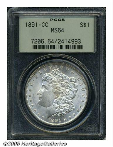 <B>1891-CC<S$1> MS64 PCGS.</B></I> Lustrous surfaces display a touch or two of light tan color, especially on Liberty's hair. The design elements are well struck, except for weakness in the hair above Liberty's ear. Luster grazes on Liberty's cheek and neck and in the left (facing) obverse field define the grade.<BR><I>From The Milwaukee Shore Collection.</B></I>