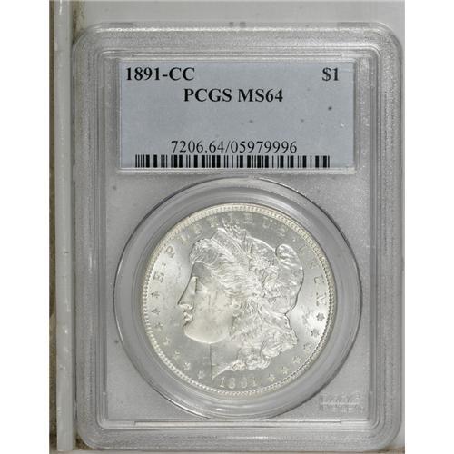 <B>1891-CC S$1 MS64 PCGS.</B></I> Occasional wisps of light tan color reside on highly lustrous surfaces that offer fairly well struck design features. Some light obverse marks limit the grade. Light roller marks are evident on Liberty's ear and hair.<BR><BR><b>Shipping:</b> Coins & Currency (<a target="_blank" href="http://www.heritageauctions.com/common/shipping.php">view shipping information</a>)