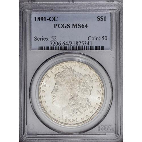 <B>1891-CC<img border='0' src='http://www.heritagecoins.com/images/star.gif' width=10 height=10>$1> MS64 PCGS.</B></I> The surfaces of this near-Gem exhibit glowing luster and a thin layer of gold-tan patination. Except for weakness in the hair above Liberty's ear, the design elements are well brought up. Minute marks on Liberty's neck and cheek define the grade.