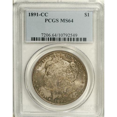 <B>1891-CC S$1 MS64 PCGS.</B></I> This Choice and well struck example is softly lustrous beneath heavy patina. The pearl-gray sections have a hint of blue, while the slate-gray peripheral zones and golden splashes take on peach accents.<BR><BR><b>Shipping:</b> Coins & Currency (<a target="_blank" href="http://www.heritageauctions.com/common/shipping.php">view shipping information</a>)