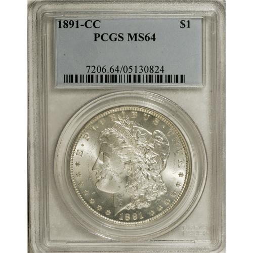 <B>1891-CC S$1 MS64 PCGS.</B></I> This highly lustrous near-Gem has a hint of frost on the devices. Above-average detail and modestly marked surfaces further enhance the eye appeal of this silver-white Carson City dollar.<BR><BR><b>Shipping:</b> Coins & Currency (<a target="_blank" href="http://www.heritageauctions.com/common/shipping.php">view shipping information</a>)