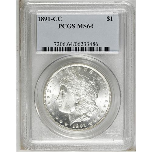 <B>1891-CC<img border='0' src='http://www.heritagecoins.com/images/star.gif' width=10 height=10>$1> MS64 PCGS.</B></I> VAM-3. A Top 100 Variety. This intricately struck and essentially brilliant near-Gem features dazzling luster and a well preserved reverse. A perpetually popular CC-mint issue.
