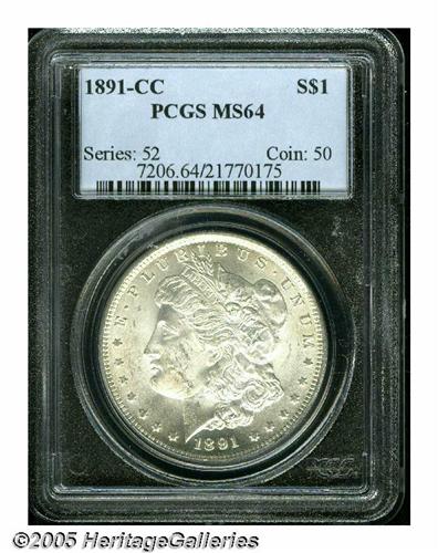 <B>1891-CC<S$1> MS64 PCGS.</B></I> VAM-3. A Top 100 Variety. The "Spitting Eagle." Well struck with bright, untoned, chalk-white surfaces that have a noticeable layer of mint frost on both sides, and seem minimally marked for the assigned grade, with just a few superficial luster grazes evident on the cheek, and in the obverse fields.