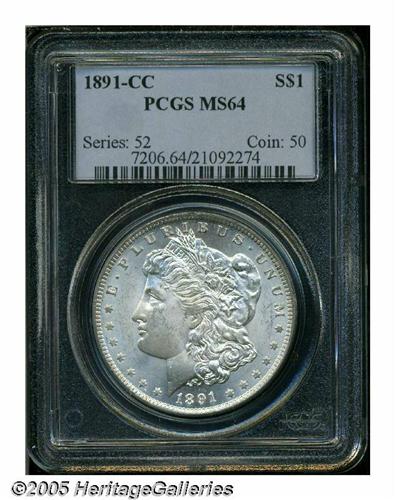 <B>1891-CC<S$1> MS64 PCGS.</B></I> VAM-3. A Top 100 Variety. White, with icy cartwheel luster. Well preserved for the grade, with reasonably light, wispy abrasions that distract very little.