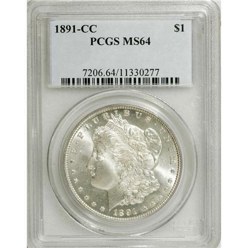<B>1891-CC S$1 MS64 PCGS.</B></I> Well struck except for a touch of softness on the hair detail just above Liberty's ear, with intense mint luster and untoned, stone-white surfaces. A few minor marks limit the grade.<BR><BR><b>Shipping:</b> Coins & Currency (<a target="_blank" href="http://www.heritageauctions.com/common/shipping.php">view shipping information</a>)
