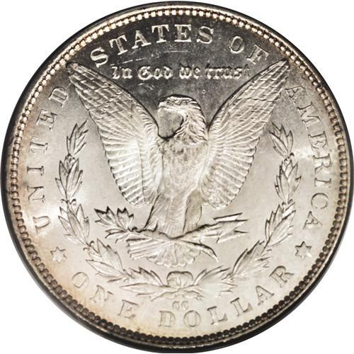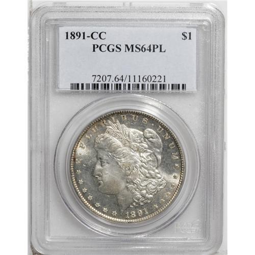 <B>1891-CC<img border='0' src='http://www.heritagecoins.com/images/star.gif' width=10 height=10>$1> MS64 Prooflike PCGS.</B></I> VAM-3. A Top 100 Variety. The so-called "Spitting Eagle". The design motifs are generally well struck, although softness is seen, as usual, just above Liberty's ear. Typically marked for the grade with a faint, milky patina over portions of both sides that does not impede the reflective mirrors. An infrequently seen Carson City issue with the Prooflike designation.