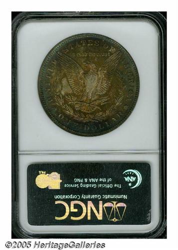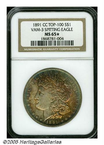 <B>1891-CC<S$1> MS65 NGC.</B></I> VAM-3. A Top 100 Variety. Beautiful orange and ruby centers are bounded by ocean-blue and lime peripheries. A sharply struck Gem, the few faint blemishes are not evident because of the splendid patination. The VAM-3 "Spitting Eagle" is not a rarity except in high grades, but its popularity is ensured.
