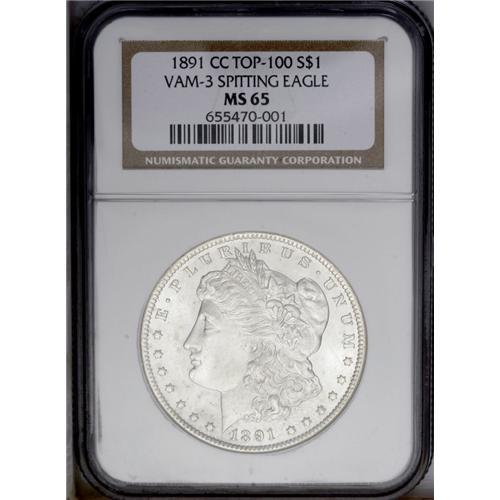 <B>1891-CC<img border='0' src='http://www.heritagecoins.com/images/star.gif' width=10 height=10>$1> MS65 NGC.</B></I> VAM-3. A Top 100 Variety. This is the famous Spitting Eagle variety, one of the most recognizable of the '91-CC VAM varieties. It is a sharply struck Gem with frosty silver luster and excellent eye appeal. <BR><BR><B>Important notice:</B> Heritage usually auctions material at the rate of 200-250 lots per hour. On some occasions eBay Live bid software or the Internet may not be able to keep up with the pace of the auction. We recommend placing a realistic absentee bid now as insurance to avoid disappointment. Occasionally the auctioneer may eliminate or reject an eBay Live bid, and the auctioneer may also reopen a lot after the close of the eBay live bidding (usually because we missed an audience bid), and may reject your bid even if it shows you as the winning bidder. By bidding via eBay Live, you agree that Heritage may award the lot to another bidder at its sole discretion under the circumstances described above or any other reasonable circumstances. Since eBay bids are not shown to us until we open the lot on the floor, we treat those bids just like floor bids. In most cases the floor responds before the eBay bid is presented to us, due to Internet lag time, so for consistency we have made it a policy that floor bids are always considered first over tie eBay live bids. Also please note that all Heritage lots purchased through eBay Live carry a 20% Buyer's Premium. Please make sure you read the Terms and Conditions before you bid. This lot is being auctioned in conjunction with a live floor auction by Heritage Galleries & Auctioneers. All final auction and invoice information will be supplied by Heritage Galleries & Auctioneers, and all other information should be considered preliminary. Lot:3579 <BR><BR><B>Winning Notification and Billing:</B> After the FINAL session in this auction is complete, Heritage will send e-mail and snail mail invoices. This process normally takes several days. All final auction and invoice information will be supplied by Heritage Galleries & Auctioneers, and all other information should be considered preliminary. <BR><BR>This auction will be conducted on a live auction floor and over the Internet through eBay Live. If you choose to place an absentee bid, please take a moment to <font color='#0000ff'><u><a href='http://pages.ebay.com/liveauctions/help/before/laabsentee.html'>learn how eBay Live absentee bidding works</a></u></font><font color='#000000'>