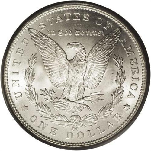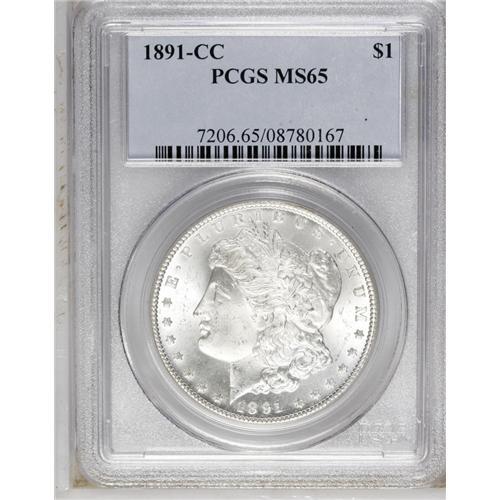 <B>1891-CC<img border='0' src='http://www.heritagecoins.com/images/star.gif' width=10 height=10>$1> MS65 PCGS.</B></I> A frosty and beautiful no-questions Gem, with radiant luster over the superlative untoned surfaces. This kind of coin grants the instant eye appeal knowledgeable collectors seek for those "just right" coins. Without a couple of insignificant luster grazes behind the head, this piece would likely achieve an even higher grade. A couple of curious, raised die lines, as struck, arise in the reverse field through the motto. PCGS has graded 33 pieces finer (8/06).