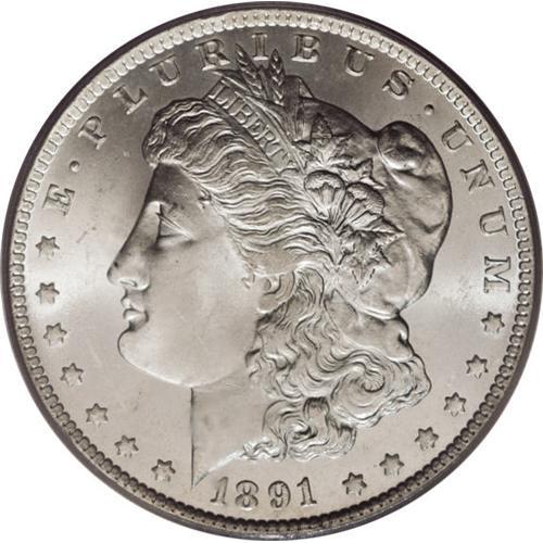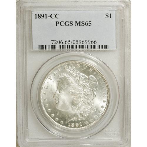 <B>1891-CC S$1 MS65 PCGS.</B></I> The 1891-CC is popular as one of the more generally obtainable late-series CC-mint issues with good production values. The present example boasts a fairly sharp strike--not always the case--and minimal abrasions on the brilliant untoned surfaces, save for a single luster break on Liberty's cheek. PCGS has certified 31 coins finer (4/07).<BR><BR><b>Shipping:</b> Coins & Currency (<a target="_blank" href="http://www.heritageauctions.com/common/shipping.php">view shipping information</a>)