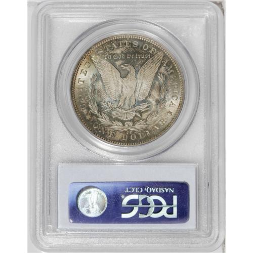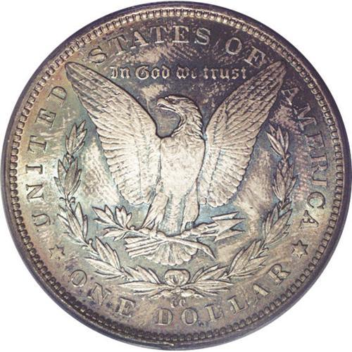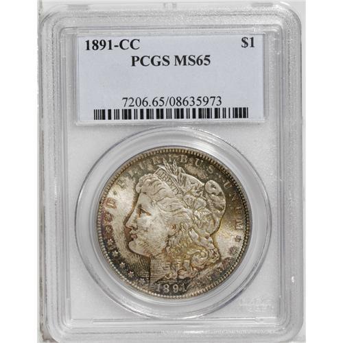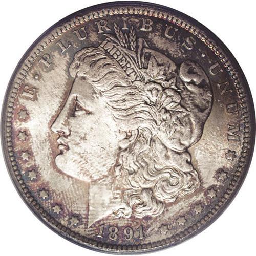 <B>1891-CC<img border='0' src='http://www.heritagecoins.com/images/star.gif' width=10 height=10>$1> MS65 PCGS.</B></I> This lustrous example has fascinating toning. The base patina is dove-gray, though more lustrous than the usual perception of the color; patches of bronze and teal toning appear on each side, as do streaky areas that alternate gray and brown in woodgrain patterns. A nicely struck Gem with plenty of catchy eye appeal.
