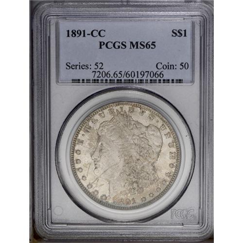 <B>1891-CC<img border='0' src='http://www.heritagecoins.com/images/star.gif' width=10 height=10>$1> MS65 PCGS.</B></I> Toned with splashes of light gold with a dash of crimson and blue near the date. The reverse is well matched, with deeper gold layered over the luster. Well struck for this issue, and seldom seen in Gem grades. There are few mentionable distractions of any kind. PCGS has graded 38 finer (3/06). <BR><BR><B>Important notice:</B> Heritage usually auctions material at the rate of 200-250 lots per hour. On some occasions eBay Live bid software or the Internet may not be able to keep up with the pace of the auction. We recommend placing a realistic absentee bid now as insurance to avoid disappointment. Occasionally the auctioneer may eliminate or reject an eBay Live bid, and the auctioneer may also reopen a lot after the close of the eBay live bidding (usually because we missed an audience bid), and may reject your bid even if it shows you as the winning bidder. By bidding via eBay Live, you agree that Heritage may award the lot to another bidder at its sole discretion under the circumstances described above or any other reasonable circumstances. Since eBay bids are not shown to us until we open the lot on the floor, we treat those bids just like floor bids. In most cases the floor responds before the eBay bid is presented to us, due to Internet lag time, so for consistency we have made it a policy that floor bids are always considered first over tie eBay live bids. Also please note that all Heritage lots purchased through eBay Live carry a 20% Buyer's Premium. Please make sure you read the Terms and Conditions before you bid. This lot is being auctioned in conjunction with a live floor auction by Heritage Galleries & Auctioneers. All final auction and invoice information will be supplied by Heritage Galleries & Auctioneers, and all other information should be considered preliminary. Lot:3580 <BR><BR><B>Winning Notification and Billing:</B> After the FINAL session in this auction is complete, Heritage will send e-mail and snail mail invoices. This process normally takes several days. All final auction and invoice information will be supplied by Heritage Galleries & Auctioneers, and all other information should be considered preliminary. <BR><BR>This auction will be conducted on a live auction floor and over the Internet through eBay Live. If you choose to place an absentee bid, please take a moment to <font color='#0000ff'><u><a href='http://pages.ebay.com/liveauctions/help/before/laabsentee.html'>learn how eBay Live absentee bidding works</a></u></font><font color='#000000'>