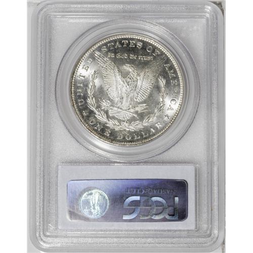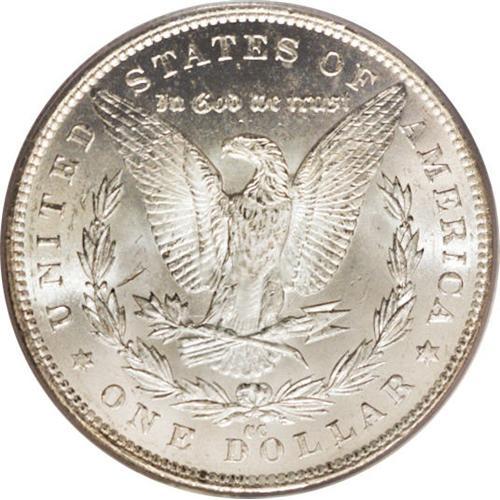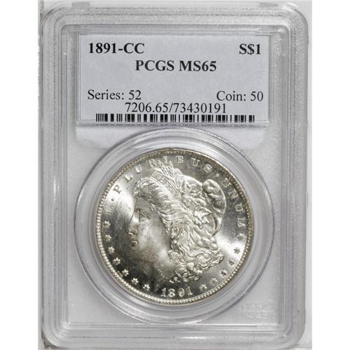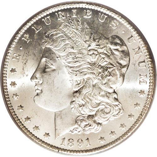 <B>1891-CC<img border='0' src='http://www.heritagecoins.com/images/star.gif' width=10 height=10>$1> MS65 PCGS.</B></I> VAM-3. A Top 100 Variety. A hint of golden patina visits this thoroughly lustrous Carson City Gem, although many would consider the piece to be brilliant. The strike is sharp, but the coin's best attribute is its unblemished surfaces. The sweet spot of the cheek is particularly smooth.