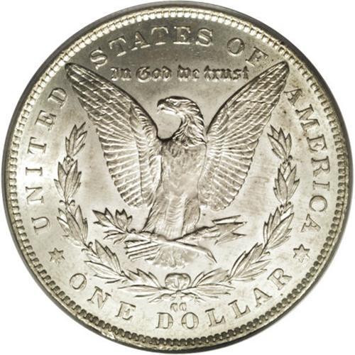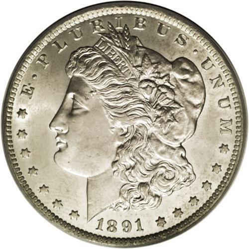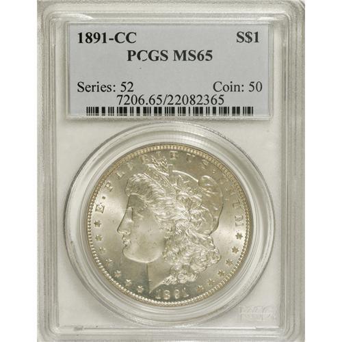 <B>1891-CC S$1 MS65 PCGS.</B></I> VAM-3. A Top 100 Variety. The Sherman Silver Purchase Act of 1890 was a thinly disguised silver-price support, requiring the Treasury to buy 4.5 million ounces of silver and to coin 2 million silver dollars per month for a year, after which a coinage requirement--sufficient for the redemption of Treasury notes--would be at the discretion of Secretary of the Treasury. Carson City silver dollar coinage was correspondingly healthy in 1890 and 1891, although it moderated toward the end of the latter year, according to Rusty Goe's informative <I>The Mint on Carson Street.</B></I> 1891-CC silver dollars can be encountered in Gem and finer grades with some frequency. While the 1890-CC has its Tail Bar variety, the 1891-CC has its Spitting Eagle. This piece offers brilliant surfaces that are completely untoned save for a light golden patina.<BR><BR><b>Shipping:</b> Coins & Currency (<a target="_blank" href="http://www.heritageauctions.com/common/shipping.php">view shipping information</a>)