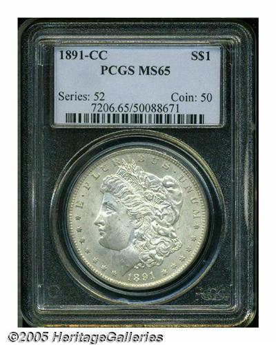 <B>1891-CC<S$1> MS65 PCGS.</B></I> VAM-3. A Top 100 Variety. For the Carson City Dollars struck between 1881 and 1885, a large percentage of the original mintage emerged from the GSA hoard in Uncirculated grades. Not so for the CC-mint Dollars struck between 1889 and 1893, since these are comparatively scarce, especially with Gem quality. This crisply struck example possesses exemplary fields, and only a few inconsequential marks are on the face. Dusky chestnut and cream-gray color does not deny the coruscant cartwheel luster.