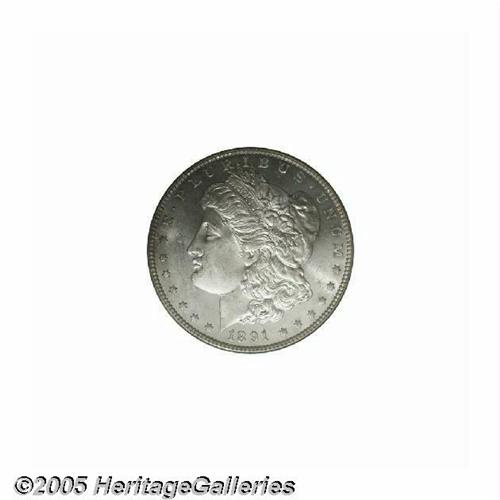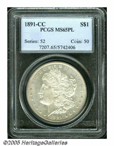 <B>1891-CC<S$1> MS65 Prooflike PCGS.</B></I> The 1891-CC is a very scarce dollar with prooflike reflectivity in the fields. The ones that are known generally grade MS64 or less. PCGS has only certified 11 Gem Prooflikes with two finer, while NGC has graded five in MS65 with only one finer (6/05). The fields show pleasing reflectivity and are refreshingly free from abrasions. The obverse has a light overlay of golden toning, while the reverse is unaffected and brilliant. Just a bit softly struck in the centers.