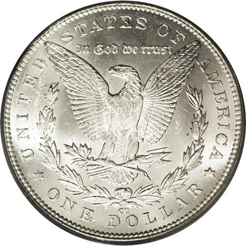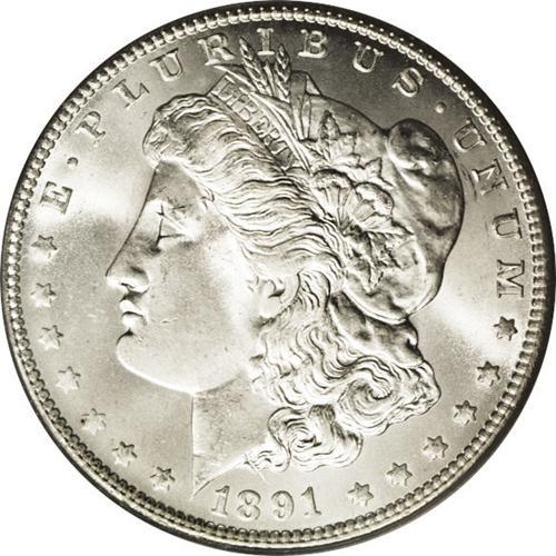 <B>1891-CC<img border='0' src='http://www.heritagecoins.com/images/star.gif' width=10 height=10>$1> MS66 PCGS.</B></I> Both sides exhibit a creamy, nearly blemish-free appearance and show a completely brilliant snow-white finish overall. Months or even years of searching could hardly produce a more frosty, more impressively preserved example of this popular and conditionally scarce Carson City dollar. Population: 36 in 66, 1 finer (4/06).