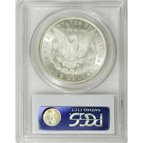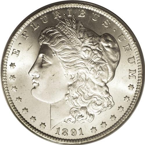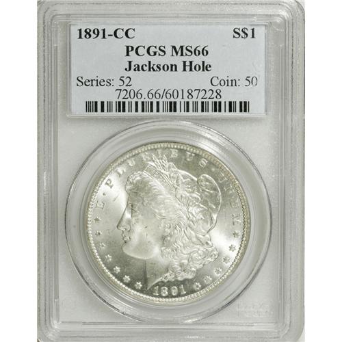 <B>1891-CC S$1 MS66 PCGS.</B></I> Ex: Jackson Hole. VAM-3. This is the famous "Spitting Eagle" variety that is known to all advanced Morgan dollar collectors. A small die chip leaves a tiny raised spot in the field just below the eagle's beak. Both sides of this Premium Gem have frosty silver luster with no evidence of toning; the surfaces are fully brilliant and white. It is also a sharply struck example with full obverse and reverse design features. Dave Bowers commented: "Virtually all are lustrous and have superb eye appeal, but not all are sharply struck. Do some looking around before you write a check." For those who have done their share of looking, this would be an excellent opportunity to write that check. Population: 30 in 66, 1 finer (2/07).<BR><I>From The Jackson Hole Collection.</B></I><BR><BR><b>Shipping:</b> Coins & Currency (<a target="_blank" href="http://www.heritageauctions.com/common/shipping.php">view shipping information</a>)
