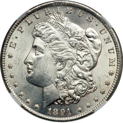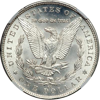 1891-CC Top 100 VAM-3 Spitting Eagle. NGC graded MS-61. An extremely popular VAM variety. The reverse is quite lustrous with minimal marks, there is, however, a long recessed line on Liberty's cheek and partway into the neck (PCGS # 7206) .